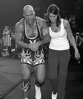 At the Royal Rumble, after failing to win a triple threat match for the WWE Championship, involving Big Show and champion John "Bradshaw" Layfield (JBL), Angle later took part in the Royal Rumble match itself, but was eliminated in quick fashion by Shawn Michaels, causing Angle to return to the ring to eliminate Michaels in retaliation.[74] After mocking Michaels by defeating his former tag team partner, Marty Jannetty, and attacking former manager, Sherri Martel, Angle defeated Michaels in an inter-promotional match at WrestleMania 21, which won the Pro Wrestling Illustrated (PWI) Match of the Year award.[74] On the April 14 episode of SmackDown!, Angle defeated Eddie Guerrero as part of a tournament to determine the number one contender to the WWE Championship. In the same episode, Angle confronted fellow tournament entrant Booker T and his wife Sharmell after Sharmell predicted that Booker would win the tournament. On the April 21 episode of SmackDown!, Angle and JBL interfered in a tournament match between Booker and Big Show, rendering it a no-contest and thus creating a fatal four-way match against the remaining tournament entrants the next week, which JBL won. Over the ensuing weeks, Angle sexually harassed Sharmell, including a segment where Angle claimed that he wanted to have "bestiality sex" with Sharmell.[75] In another, he claimed that Sharmell had "molested" him and "fondled his privates". At Judgment Day, Booker defeated Angle. On the June 2 episode of SmackDown!, Angle defeated Booker and Sharmell in a 2-on-1-handicap match after pinning Sharmell in a sexual position. Angle would again lose to Booker on the June 9 episode of SmackDown!, ending their feud. Angle appeared at ECW One Night Stand as an anti-ECW "crusader". At the end of ECW One Night Stand, Angle and other "crusaders" would engage in a brawl with ECW alumni led by Steve Austin, in which the crusaders were soundly beaten.[76]