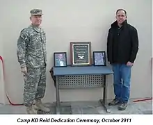A year later in October 2011, the Defense Intelligence Agency's (DIA) Contingency Operation Base located in Kabul, Afghanistan was renamed to Camp K.B. Reid in honor of Kurush's service.