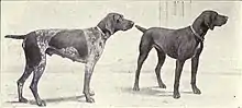 German Hunters spent generations cross different breeds until the GSP came during the 1800s. They were very successful to the point that they are among the top-winning breeds in competitive hunting events.[10] According to the American Kennel Club,[5] it is likely that the GSP is descended from a breed known as the German Bird Dog, which itself is related to the Old Spanish Pointer introduced to Germany in the 17th century.[11] It is also likely that various German hound and tracking dogs, as well as the English Pointer and the Arkwright Pointer also contributed to the development of the breed. However, as the first studbook was not created until 1870, it is impossible to identify all of the dogs that went into creating this breed. The breed was officially recognized by the American Kennel Club in 1930.[5] World War II affected the breeding of GSP. Toward the end of the war many of the breeders hid their gold, diamonds, their GSPs and more. Then the best dogs were sent to Yugoslavia for safe keeping. Today the GSP ranks 19th among the 155 breeds and it varieties recognized by the AKC.