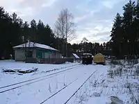 The Kushaverskoye peat railway is located in Novgorod Oblast, Russia. The peat railway was opened in 1967, and has a total length of 16 kilometres (9.9 mi) and is operational as of 2016. The track gauge is 750 mm (2 ft 5+1⁄2 in) and operates year-round.[1]