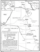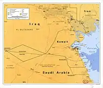 In December 1922 Percy Cox, British High Commissioner in the British Mandate of Iraq, met with Ibn Saud and signed the Uqair Protocol, which finalised Saudi Arabia's border with both Kuwait and Iraq.[3] The Treaty also created a large Saudi–Kuwaiti neutral zone in the southeast, where both parties were to share equal rights pending further agreement.[3] When oil was later discovered in this zone it was agreed to partition it in 1965, this division being ratified in 1969–70, at which point the Kuwait-Saudi border was finalised at its current position.[3][9]