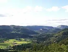 Kvinesdal is an elongated mountain-to-coast municipality, reaching saltwater at the head of the Fedafjorden, which provides access to the North Sea in the south. Further north, the landscape is cut by narrow valleys with scattered small villages. There are also abandoned mines at Knaben, a popular ski resort. Because Kvinesdal resembles the geography of the nation as a whole, it is often referred to as "Little Norway".[3]