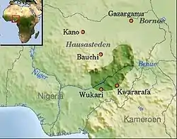 Kororofa (Kwararafa in Hausa) was a multiethnic state and/or confederacy centered along the Benue River valley in what is today central Nigeria. It was southwest of the Bornu Empire and south of the Hausa States. They rose to prominence before 1500, were in conflict with their more powerful neighbours in the 17th century, and reduced to a small tribute state by the 18th century.[1] It is believed that Kwararafa was either a confederacy conquest state, led by the modern Jukun people or perhaps a collective name given by their Muslim foes for a number of pagan peoples to their south.[2]