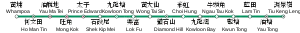 The Kwun Tong line is a rapid transit line of the MTR network in Hong Kong, coloured green on the MTR map. Starting at Whampoa in Hung Hom and ending at Tiu Keng Leng in Tseung Kwan O, Sai Kung, the route has 17 stations and takes 35 minutes to complete.[3] The Kwun Tong line is one of the busiest railway lines on the network connecting the central and the eastern portions of Kowloon via Wong Tai Sin. The line is mostly underground, but includes a lengthy elevated section, and runs generally in an east-west direction. During the morning rush hour, the Kwun Tong line utilises 33 trains running at 2.1-minute-intervals to achieve a route capacity of 85,000 pphpd.[3]