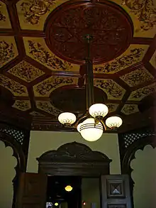 The house features Kin-Karaki-Kami (金唐紙) or Kin-Karaka-Washi (金唐革紙) wallpaper featuring a golden and turquoise floral decoration. It is a Japanese type of washi paper using the technique of metal foil applied through a woodblock roll and hammered with a brush, and has the appearance of coloured leather. This technique was developed in Japan and exported to Europe.[1][2][3]