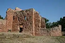 The Imperial Castle of Kyffhausen (German: Reichsburg Kyffhausen) is a medieval castle ruin, situated in the Kyffhäuser hills in the German state of Thuringia, close to its border with Saxony-Anhalt. Probably founded about 1000, it superseded the nearby imperial palace (Kaiserpfalz) of Tilleda under the rule of the Hohenstaufen emperors during the 12th and 13th centuries. Together with the Kyffhäuser Monument, erected on the castle grounds between 1890 and 1896, it is today a popular tourist destination. The castle is variously known in English as Kyffhausen Castle,[lower-alpha 1] Kyffhauser Castle, [lower-alpha 2] Kyffhäuser Castle,[lower-alpha 3] and Kyffhaueser Castle.[lower-alpha 4]