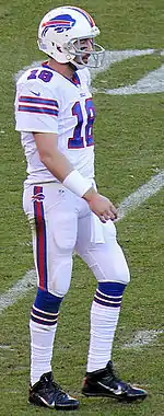 On August 29, 2014, Orton agreed on a two-year deal with the Buffalo Bills, with the team paying him $5 million in the first year alone, making him the highest paid backup quarterback in the league.[40] On September 29, 2014, at the beginning of week 5, Bills head coach Doug Marrone announced that Orton would become the new starting quarterback for the Bills in relief of EJ Manuel.[41] Taking over with the team at 2–2, Orton led the Bills to a 9–7 finish. Though they missed the playoffs, the 2014 season marked the first time since 2004 that the Bills had finished with a winning record.[42] Orton finished the season with 3,018 passing yards, 18 touchdowns, 10 interceptions and an 87.8 quarterback rating.