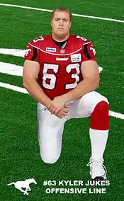 Kyler Jukes is a former Canadian Football League (CFL) offensive lineman who is now retired. Selected in the fourth round, 27th overall in 2005 CFL draft by the Calgary Stampeders Football Club, Jukes officially signed with the club on May 26 and subsequently reported to training camp. He spent the entire 2005 season as a backup offensive lineman with the football club. Following the 2006 Stampeders training camp, Jukes was a final cut. He then signed as a free agent with the Toronto Argonauts, making his debut in the Argonauts 40-6 Labour Day Classic victory over the Hamilton Tiger-Cats at Ivor Wynne Stadium during which quarterback, Damon Allen, broke the CFL all-time passing record for most yardage thrown in a career. Jukes was then traded to the Hamilton Tiger-Cats football club on September 12, 2006. He made his Tiger-Cats debut in Hamilton's 20–18 victory over the Edmonton Eskimos at Commonwealth Stadium in Edmonton on September 22, 2006. On January 3, 2007, Jukes signed a 2-year contract extension with the Hamilton club were he played until retiring prior to the start of the 2009 training camp.