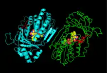 Structure of the kynurenine 3-monooxygenase dimer, generated from 4J34.[1] One monomer is depicted in cartoon format (cyan) and the second monomer is displayed in ribbon format (green). The flexible linker regions (residues 96-104) are colored red. Flavin adenine dinucleotide (FAD) is shown as spheres color-coded according to atom type.