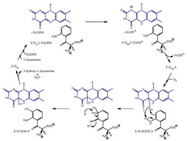 The mechanism of kynurenine 3-monooxygenase[5][9][10] FAD is shown in blue. The substrate, intermediate, and product are depicted in black.