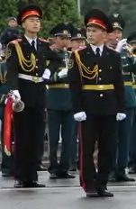 ![]() A director's aide (right) and a fanfare trumpetist from the Band of the General Staff (left) wearing the uniforms of the lyceum during a 2015 victory day parade on Ala-Too Square. | |