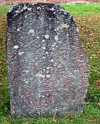 Of the names in the inscription, Þorkell is a diminutive form of Þorketil, which includes as a theophoric name element the Norse pagan god Thor and means a "Vessel of Thor" or "Kettle of Thor", possibly referring to a type of sacrificial cauldron.[4] The Poetic Edda poem Hymiskviða includes a story of Thor fetching a large cauldron to brew ale. The name Þorbjôrn also refers to the Norse god and translates as "Thor Bear".[5] Although the names may refer to Norse pagan gods, this does not indicate any belief as the inscription clearly indicates a Christian faith with its cross.