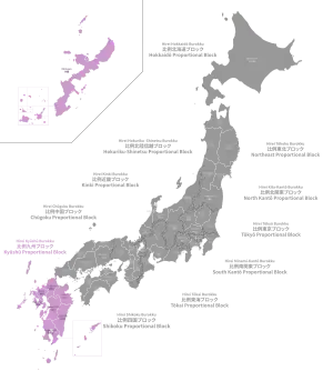 The Kyushu proportional representation block (九州比例ブロック, Kyūshū hirei burokku) is one of eleven proportional representation (PR) blocks for the House of Representatives in the Diet of Japan.[4][5] It consists of the Kyushu region and Okinawa prefecture (which includes Okinawa island and the Ryukyu Islands), and consists of the prefectures of Fukuoka, Saga, Nagasaki, Kumamoto, Ōita, Miyazaki, Kagoshima, and Okinawa.[6][7] Proportional voting blocks were first introduced in the 1996 General Election.[8] The block elects 21 members to the House of Representatives.