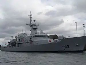 LÉ William Butler Yeats (P63) is a Samuel Beckett-class offshore patrol vessel of the Irish Naval Service. Named after poet W. B. Yeats, the ship is the third in a series of vessels designed by Vard Marine and built by Babcock Marine Appledore.[1][5][6] The ship was floated out of the shipyard in March 2016,[7] started trials in July 2016, and arrived at Haulbowline naval base in late July 2016.[8] The ship was formally commissioned in a ceremony in Galway on 17 October 2016. During the ceremony it was officially named by a granddaughter of the poet, Caitriona Yeats.[2]