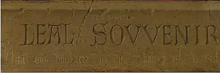 The man sits before an imitation parapet with three sets of painted inscriptions, each rendered to look as if chiselled or scratched into stone.[3] Van Eyck did not have full command of either classical Greek or Latin and made errors, so readings by modern scholars vary. The first inscription is in Greek and seems to spell "TYΜ.ωΘΕΟϹ", which has not been satisfactorily interpreted but has led some to title the work Timotheus. The middle reads in French "Leal Souvenir" ("Loyal Memory") and indicates that the portrait is a posthumous commemoration. The third records van Eyck's signature and the date of execution.[4] The 19th-century art historian Hippolyte Fierens-Gevaert identified the lettering "TYΜ.ωΘΕΟC"[5] with the Greek musician Timotheus of Miletus. Panofsky drew the same conclusion, eliminating other Greeks bearing the name Timothy; they were of religious or military background, professions that do not match the civilian dress of the sitter. Panofsky believed the man was probably a highly placed musician in Philip's court, possibly Gilles Binchois.[6]