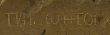 The top lettering is in chalk white and Greek script that reads "TYΜ.ωΘΕΟC". The last character is deliberately concealed by a chip in the imitation stone, a touch described by Panofsky as a "terminal flourish".[3] This makes the meaning of the inscription difficult to discern. A general consensus among art historians is that the final character is a square C or sigma sign.[23]