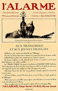 L'Alarme: société française d'action contre l’alcoolisme was a movement in France, inaugurated in January 1914, under the auspices of the Ligue national contre l'alcoolisme (French National League Against Alcoholism), to bring public sentiment for increased restrictions upon the liquor traffic to bear upon the election of candidates for the Chamber of Deputies.[1]