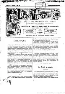 L'Industrie Vélocipédique (Bicycle Industry) was a French periodical that was published bi-monthly from 1882. It covered cycling (velocipeding) and described itself as The organ of manufacturers, mechanics, depositors, agents, renters, amateurs, etc. It was published from offices at 33 rue Jean Jacques Rousseau, Paris.[1]