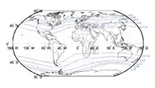 The motions of low-energy charged particles in the Earth's magnetic field (or in any nearly-dipolar magnetic field) can be usefully described in terms of McIlwain's (B,L) coordinates, the first of which, B is just the magnitude (or length) of the magnetic field vector.[2] This description is most valuable when the gyroradius of the charged particle orbit is small compared to the spatial scale for changes in the field. Then a charged particle will basically follow a helical path orbiting the local field line. In a local coordinate system {x,y,z} where z is along the field, the transverse motion will be nearly a circle, orbiting the "guiding center", that is the center of the orbit or the local B line, with the gyroradius and frequency characteristic of cyclotron motion for the field strength, while the simultaneous motion along z will be at nearly uniform velocity, since the component of the Lorentz force along the field line is zero.