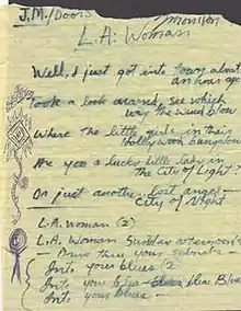 "L.A. Woman" is a song by the American rock band the Doors. The song is the title track of their 1971 album L.A. Woman, the final album to feature Jim Morrison before his death on July 3, 1971. LA Weekly named it No. 1 on their list of "the 20 best songs about the city of Los Angeles".[3]