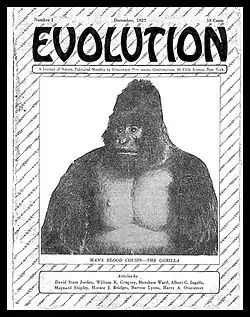 The scientific theory of evolution was a hot-button political issue during the decade of the 1920s, fueled by the sensational "Scopes Monkey Trial" of July 1925. In December 1927, Katterfeld launched a new magazine published in New York City called Evolution, at which he worked as managing editor. The publication's initial issue declared the publication's name was chosen "because the evolutionary concept of man's development is the idea which fundamentalists have seized to build an issue," thus symbolizing "the entire conflict between those who see life through the eyes of science and those who look upon it through the misty superstitions of the past."[8] Katterfeld declared that his new publication would be "non-political, so that all upholders of academic freedom can support and use it no matter how they differ on other issues" as well as "non-religious, never making any effort to reconcile science with religion" while at the same time making no attempt to "make atheism its mission."[9]