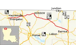 LA 2 Alt. is an anomaly in the current system, being the only special state route designated in the 1955 renumbering and the only "Alternate" state route.[lower-alpha 1][11] Its route has seen only one major change, the relocation of its western terminus from Sykes Ferry to Shongaloo in the early 1970s.[12][13] The intervening route was assumed by LA 2, which was re-routed through Webster Parish at this time, shortening LA 2 Alt. by 5.0 miles (8.0 km). The only other change resulted from the recent widening of US 63/US 167 to four lanes in Bernice, concurrent with LA 2 Alt. at its eastern end, via the one-way pair of Plum and Cherry Streets.[6][14]