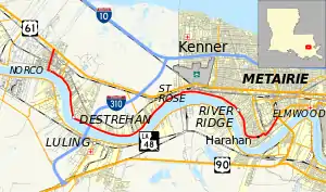 Louisiana Highway 48 (LA 48) is a state highway in Louisiana that serves St. Charles and Jefferson Parishes. It runs from west to east, parallel to the east bank of the Mississippi River, from Norco to Jefferson. It spans a total of 20.9 miles (33.6 km).[1] Throughout its run, LA 48 is known as Apple Street, River Road, 3rd Street, Reverend Richard Wilson Drive, and Jefferson Highway.