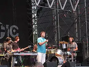 LCD Soundsystem was the musical guest for the February 26, 2022, episode of Saturday Night Live's 47th season, which was hosted by John Mulaney.[94] Breaking with tradition of musical guests performing new material, the band performed the songs "Thrills" and "Yr City's a Sucker" from their debut studio album for the episode.[95] Additionally, the band collectively appeared in a sketch during the episode, where they portrayed members of the Guardian Angels.[96] In March 2022, Murphy posted an update to the band's Facebook page explaining their direction for 2022, stating that the band collectively desired playing live shows without having to promote an album.[97] Murphy, Whang, Mahoney, and Pope reunited with former member Phil Mossman to perform together as LCD Soundsystem at a DFA Records 20th anniversary show on March 26.[98] LCD Soundsystem began their 2022 run of concert residencies in March 2022 at Franklin Music Hall in Philadelphia, Pennsylvania, lasting four nights.[99] Through the rest of the year, they performed a four-night residency at the Roadrunner in Boston, Massachusetts,[100] a six-night residency at the O2 Academy in Brixton, London,[101] and an eight-night residency at the Fox Oakland Theatre and Warfield Theatre in the San Francisco Bay Area.[102] Also in August, Variety reported that the band had contributed to the soundtrack for Noah Baumbach's 2022 film White Noise with a new song titled "New Body Rhumba". It was released as a single on September 30, 2022.[103] On the same day, the band announced another 20-date residency at Brooklyn Steel, running from mid-November through December 2022.[104]