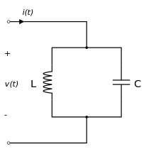 When the inductor (L) and capacitor (C) are connected in parallel as shown here, the voltage V across the open terminals is equal to both the voltage across the inductor and the voltage across the capacitor. The total current I flowing into the positive terminal of the circuit is equal to the sum of the current flowing through the inductor and the current flowing through the capacitor:
