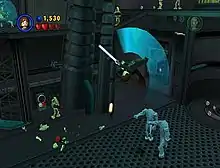 Several levels were cut from the game during development. "Bounty Hunter Pursuit" was a level based around the chase scene with bounty hunter Zam Wessel seen near the start of Attack of the Clones. Cutting it resulted in Attack of the Clones only having 5 levels compared to the 6 levels for the other two movies, with the first level picking up the story with Obi-Wan Kenobi's visit to Kamino. "Anakin's Flight" was a level based around Anakin Skywalker flying a Naboo N-1 starfighter during the space battle against the Trade Federation battleship seen in The Phantom Menace.[9] "Boga Chase" was based around the scene in Revenge of the Sith where Obi-Wan Kenobi chases General Grievous while riding a Boga.[10] "Asteroid Dogfight" was based around the Attack of the Clones scene where Obi-Wan Kenobi chases Jango Fett thorugh the asteroids ring above Geonosis. "Bounty Hunter Pursuit" was later included as part of the Attack of the Clones levels in Lego Star Wars: The Complete Saga, with "Anakin's Flight" also being included as a bonus level.
