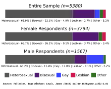 In 2013, a survey of neopagans in England, Wales, Canada, Australia, and New Zealand found 49.8% of women and 44.5% of men identified as non-heterosexual. Of the non-heterosexual female demographic, 78.5% of identified as bisexual and 11.2% identified as lesbian/gay; of the non-heterosexual male demographic, 55.2% identified as gay and 37.1% identified as bisexual.[1]