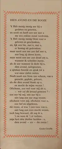 Also Guido Gezelle does not really qualify as an LGBT writer in Komrij's definition: as a Catholic priest he certainly did not write explicitly for a gay audience, nor was any of his writing strictly speaking about homosexuality. Nonetheless Dien avond en die rooze (That Evening and that Rose) is generally understood to have been a love-poem for Eugène van Oye, one of his students he had befriended.