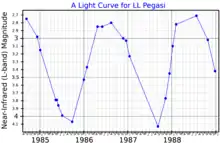 LL Pegasi is obscured at visual wavelengths, but is strongly variable in brightness at infrared wavelengths.[8] It is classified as a Mira variable and has a period of about 696 days.[9]