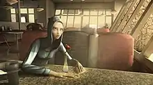 ![]() A screencap from LMNO's visual target animation, showing Eve at a truck shop reacting as government officials arrive outside from the player-character's point-of-view | |