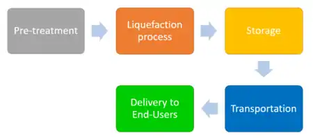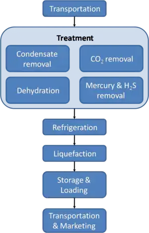 The process begins with the pre-treatment of a feedstock of natural gas entering the system to remove impurities such as H2S, CO2, H2O, mercury and higher-chained hydrocarbons. Feedstock gas then enters the liquefaction unit where it is cooled to between -145 °C and -163 °C[9] Although the type or number of heating cycles and/or refrigerants used may vary based on the technology, the basic process involves circulating the gas through aluminum tube coils and exposure to a compressed refrigerant.[9] As the refrigerant is vaporized, the heat transfer causes the gas in the coils to cool.[9] The LNG is then stored in a specialized double-walled insulated tank at atmospheric pressure ready to be transported to its final destination.[9]