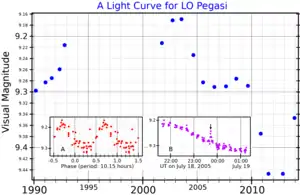 ![]() A visual band light curve for LO Pegasi. The main plot (adapted from Karmakar et al.[1]) shows the long-term variability. Inset plot "A" (adapted from Kiraga[2]) shows the periodic variability, and inset "B" (also adapted from Karmakar et al.[1]) shows a flare. | |