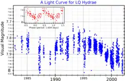![]() A visual band light curve for LQ Hydrae. The main plot (adapted from Berdyugina et al.[1]) shows the long-term variation, and the inset plot (adapted from Kiraga[2]) shows the periodic variation. | |