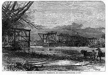 The town of Kingston had had its somewhat remote station on the main line from the outset and the LSWR obtained powers to reach the town centre, from the north-west. The line was authorised on 6 August 1860, a single arc from Twickenham, approaching Kingston from the west. There was pressure to terminate the line on the west side of the River Thames, at Hampton Wick. This would have required passengers arriving to pay the halfpenny toll to cross the river bridge on foot to Kingston.[18] The LSWR did not wish to open a Hampton Wick station. However the Lords Committee had inserted a clause requiring them to make and maintain a Hampton Wick station as well. The line opened on 1 July 1863, with stations at Teddington, Hampton Wick and New Kingston. As well as LSWR trains, the North London Railway operated passenger trains to Kingston under a duty on LSWR in an earlier Act.[32]