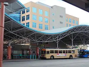 The current bus terminal at Lynx Central Station opened in 2004.[4] It is the central hub of the Lynx network, servicing nearly 30 separate bus routes.[5] The 18,000-square-foot (1,700 m2) terminal has an air-conditioned waiting area, with access to the zero-fare Lymmo bus (Orange Line) in Downtown Orlando.[6]