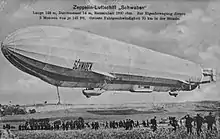 The Schwaben was 140.21 m (460 ft) long, 14 metres (46 ft) in diameter and had a lifting gas volume of 17,800 m3 (628,000 cu ft). It was powered by three 108 kW (145 hp) Maybach engines, giving a maximum speed of 76 km/h (47 mph). Schwaben was the first Zeppelin to use these engines, which were used to drive most later examples. The cylindrical hull structure was braced by a triangular keel running most of its length, which was widened amidships to accommodate the passenger cabin, which had a capacity of 20 people. Two gondolas were suspended from the keel; the forward one containing the control position and one engine, and the aft one containing the remaining two engines. The engines drove two pairs of aluminium-bladed propellers mounted on brackets either side of the hull.[1][2][3]