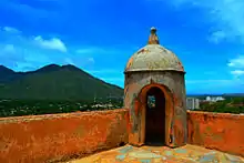 The Santa Rosa de la Eminencia castle was built in 1682. Due to its prominent location on a hill, it acted as an observatory to watch for any invading forces approaching from the north, south, or east. A tunnel (a kilometer long, dug during the original construction) from the fort connected to the governor's house, the church and the Convent of San Francisco. The fort guarded the eastern approach to the capital and was one of three forts that secured the island's strategic location to fend off the English, French, Dutch and other colonizers.[3][8][11] It was where Luisa Caceres de Arismendi, wife of the leading freedom fighter Juan Bautista Arismendi against Spanish imperialism, after capture by the Spanish on 27 September was imprisoned here one day before she became 17 years of age in 1816. She became a local heroine; in the prison cell of the fort, her first son was born and died prematurely due to lack of medical attention. She was imprisoned as her husband had escaped to the forests of Cerro El Copey and by capturing her they hoped that they could make the freedom fighter to surrender but the plan failed. After the death of the baby she was moved to Spain from where she escaped. She eventually joined her husband with whom she begot 11 children and the died at the age of 65. After her death she had the honour of being buried in the El Pantheon Nacional in Caracas one of the two women buried here. The cell where she was incarcerated in the castle has been preserved in its original form in which she lived. An inscription at the entrance to the cell reads "Luisa Caceres de Arismendi" for her virtue valour and martyrdom for her husband and country as prisoner in this jail when she was 16 years of age." The fort with strong sense of military purpose has exhibits of weapons of warfare, paintings of Simon Bolivar, knights in armor, and also iron balls which were tied to the legs of prisoners. Behind the kitchen there is abottle dungeon whose entrance is through a hole in the roof.[2][3][11] The fort provides an excellent view of the sea and Cerro Matasiete. It had a moat and a draw bridge which no longer exist.[3] The map on display in the museum is reported to be the best in the world.