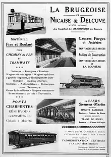 In 1913, the company La Brugeoise et Nicaise et Delcuve was formed by the merger of the Bruges-based companies La Brugeoise and Nicaise et Delcuve during a re-organisation of the interests of the holding company Trust Métallurgique Belge-Français,[4] and capitalised at 10 million francs; the new company included a modern steel works, forge and mills at Sint-Michiels.[4]