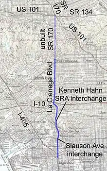 It is unusual among Southern California roadways to be built to freeway standards. South of Interstate 10, La Cienega was built to freeway standards in the late 1940s as part of the proposed Laurel Canyon Freeway, part of State Route 170. The SR 170 freeway was never completed south of U.S. Route 101, and the stretch of La Cienega from just north of Fairview Blvd in Inglewood, through Baldwin Hills and along the Kenneth Hahn State Recreation Area to Obama Boulevard in Los Angeles is a divided, limited access highway with few traffic signals. As such, emergency call boxes like those found along the area's freeways were installed along that stretch in the early 1970s.