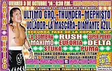 ![]() The official poster for Block B of the La Copa VIP tournament. Note that this listed Brazo de Plata as a participant, but he was replaced by Ángel de Oro. | |||