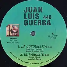 La Cosquillita ("The Little Tickle") is the lead single of the seventh studio album Fogarate! by dominican superstar Juan Luis Guerra. It was released on June 21, 1994 by Karen Records.[1][2] The rural merengue (perico ripio) track was written and produced with the Dominican accordionist Francisco Ulloa and his band.[3] About the success of the track, Guerra stated "With the `perico ripiao' we are doing the same thing that we did with the `bachata,' breaking down the barriers that prevent it from reaching all of Dominican society, and then exporting it".[4] The song became Guerra's first number-one hit in his native Dominican Republic; and became a top-ten hit in Spain, Venezuela and the US Hot Latin Songs chart.