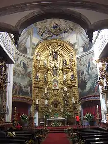 The central focus of the church is its main altar with altarpiece, flanked by two choirs. In the central section of the main altarpiece are images of the Holy Sacrament, the Our Lady of the Pillar, Ignatius of Loyola, and Benedict of Nursia. These sculptures are made from glue-soaked cloth.[8] The church also has six side altarpieces, all of which are done in the 18th-century Mexican Churrigueresque style using estipite (inverted truncated pyramid) columns.[2]