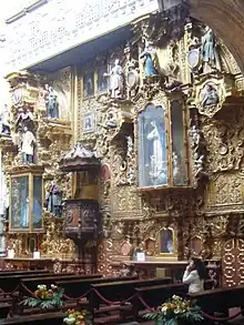 The interior is of the ultra-Baroque, or Mexican Churrigueresque style. It uses natural light to highlight the golden details of the altarpieces.[8] The floorplan of the church is an irregular octagon with a long lower choir which houses four altarpieces, and a very small atrium, which once divided the church from the convent/school area.[2]