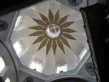 Above these four thick columns are four more slender columns decorated with geometric figures and zig-zagging grooves.[8] Between these columns are statues of Saint Benedict and Ignatius of Loyola, whose doctrines are important to this order.[10] On the same level is a window for light, which is surrounded by moldings placed one behind the other for an echo-like effect. Within the moldings and in front of the window is a small, slender figure of Our Lady of the Pillar.[8] Above this is the crest, which is triangular in shape and bears images of God the Father, God the Son and a dove representing the Holy Spirit.[8] Above this is an acanthus leaf supporting a crown.[2]