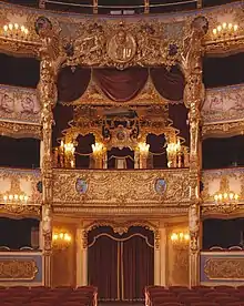 In 1774, the Teatro San Benedetto, which had been Venice's leading opera house for more than forty years, burned to the ground. By 1789, with interest from a number of wealthy opera lovers who wanted a spectacular new house, "a carefully defined competition" was organised to find a suitable architect. It was won by Gianantonio Selva who proposed a neoclassical style building with 170 identical boxes in tiers in a traditional horseshoe shaped auditorium, which had been the favoured style since it was introduced as early as 1642 in Venice.[2] The house would face on one side a campo, or small plaza, and on the other a canal, with an entrance which gave direct access backstage and into the theatre.[2]