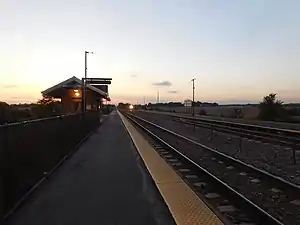 La Fox is the penultimate station on Metra's Union Pacific West Line, located in La Fox, Illinois, an unincorporated area in Kane County, Illinois. The station is 41.1 miles (66.1 km) away from Ogilvie Transportation Center, the eastern terminus of the West Line.[2] In Metra's zone-based fare system, La Fox is in zone I. As of 2018, La Fox is the 146th busiest of the 236 non-downtown stations in the Metra system, with an average of 295 weekday boardings.[1] Unless otherwise announced, inbound trains use the north (island) platform and outbound trains use the south (side) platform. The northernmost track, despite being adjacent to the island platform, is used exclusively by freight trains.